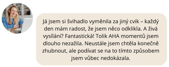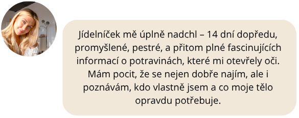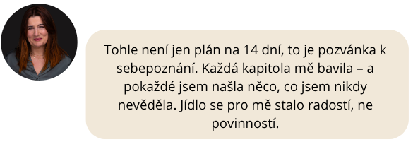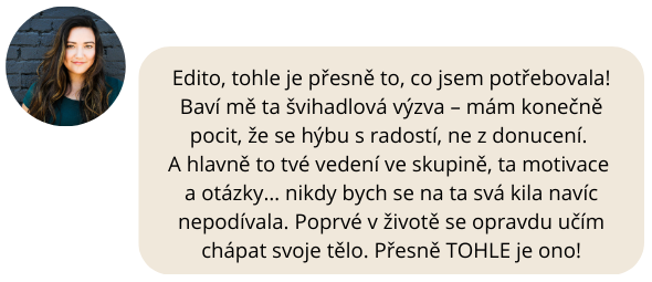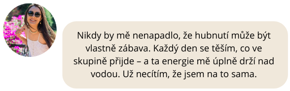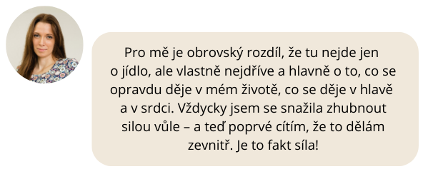 „Celý život jsem si říkala, že jsem prostě ten typ, co nikdy nezhubne. Že mi chybí disciplína, že jsem od přírody líná... A teď? Všechno se změnilo. Jím normálně! Už si neubližuju! No jasně, že jsem nemohla žádnou dietu nikdy vydržet, když jsem netušila, co mě to vlastně ovládá! Program je naprosto ÚŽASNÝ! Možnost konzultací a pravidelná online setkání! No prostě fakt pecka! Jo a ta whatsapp skupina, kde nás Edita neustále povzbuzuje a kde nám nepřestává fandit! Doporučuji všema deseti!!!"