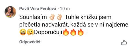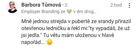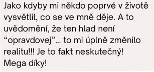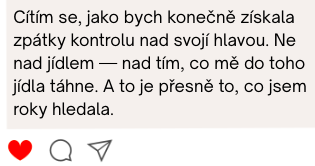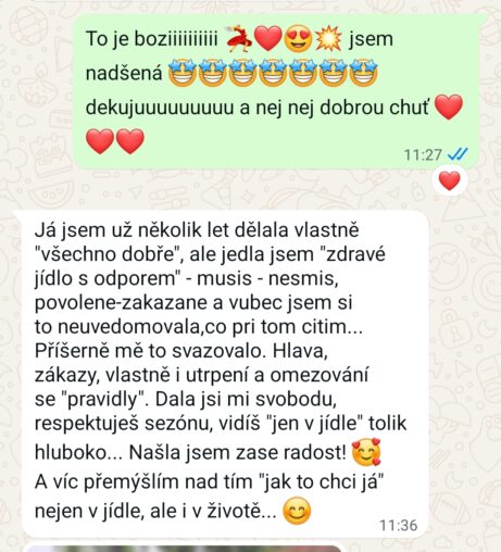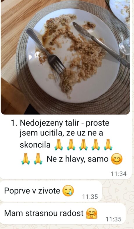 „Vždy jsem si myslela, že dietami ten svůj nekonečný kolotoč vyřeším — teď mi to přijde směšné. Tato cesta mi pomohla pochopit, proč jsem jedla tajně a proč jsem vlastně měla neustále pocit, že chci víc a víc a víc... Že ještě nemám dost. Výsledek? Tělo fakt hubne samo a já už se hlavně tolik nevážím — prostě to jen cítím na oblečení, na sobě, už to není ta urputná snaha, mám obrovskou radost z této cesty. Rodina to také cítí. Dcery mi uvařily polévku, manžel uvařil rýži se zeleninou. To mi udělalo obrovskou radost. Díky za to a rovnou hlásím, že budu určitě dál pokračovat. Dává mi to hluboký smysl a takové vedení je k nezaplacení!“